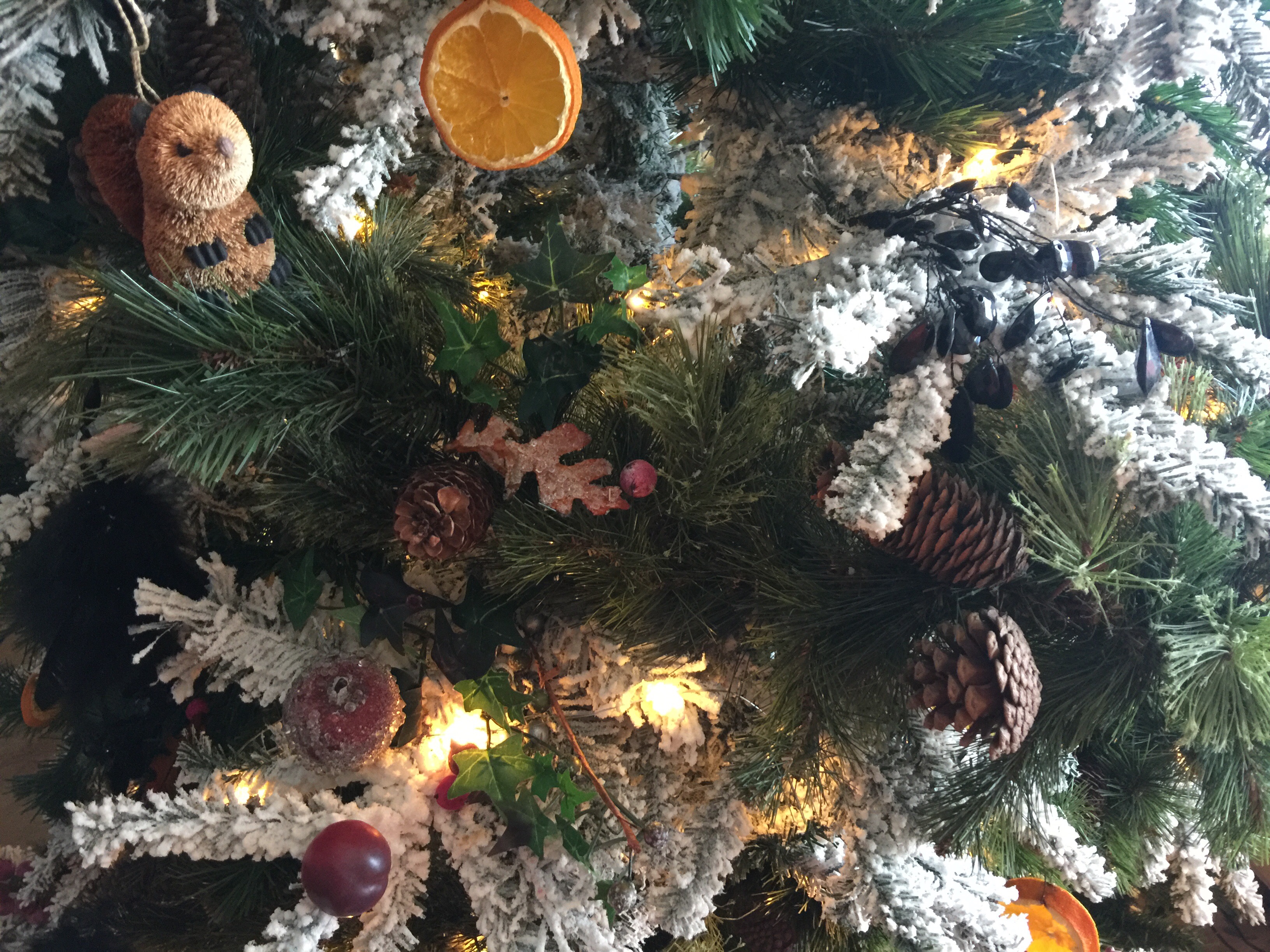 Only then does the next inexhorable stage begin, more branches from another tree stored in boxes, no vacant spaces on this monster, this year it would be stuffed to the gunnels. Im not a one for baubles and tinsel, I tend to purchase large displays and rip them apart and just stuff branches with berries and frosted fruits and plastic ivy alongside leaves and tassels and black feather fluffies. Grape bunches, Berries, Cherries, I call the tree the fruits of winter, there are three animals, one hedgehog who stays down near the lower branches, two squidganinnies (squirrels) half way up and a yellow bird high up in the top branches. Of course, there then has to be the topping out ceremony, always having the turmoil myself of being torn between a star or a fairy, I have always opted for the star, and as a fairy myself, a large piece of noble fir rammed up my backside would not be what I would want, so, the star it is, glass of wine in hand, I step back and admire, wiping a drop of joy away from my tear filled eyes.
